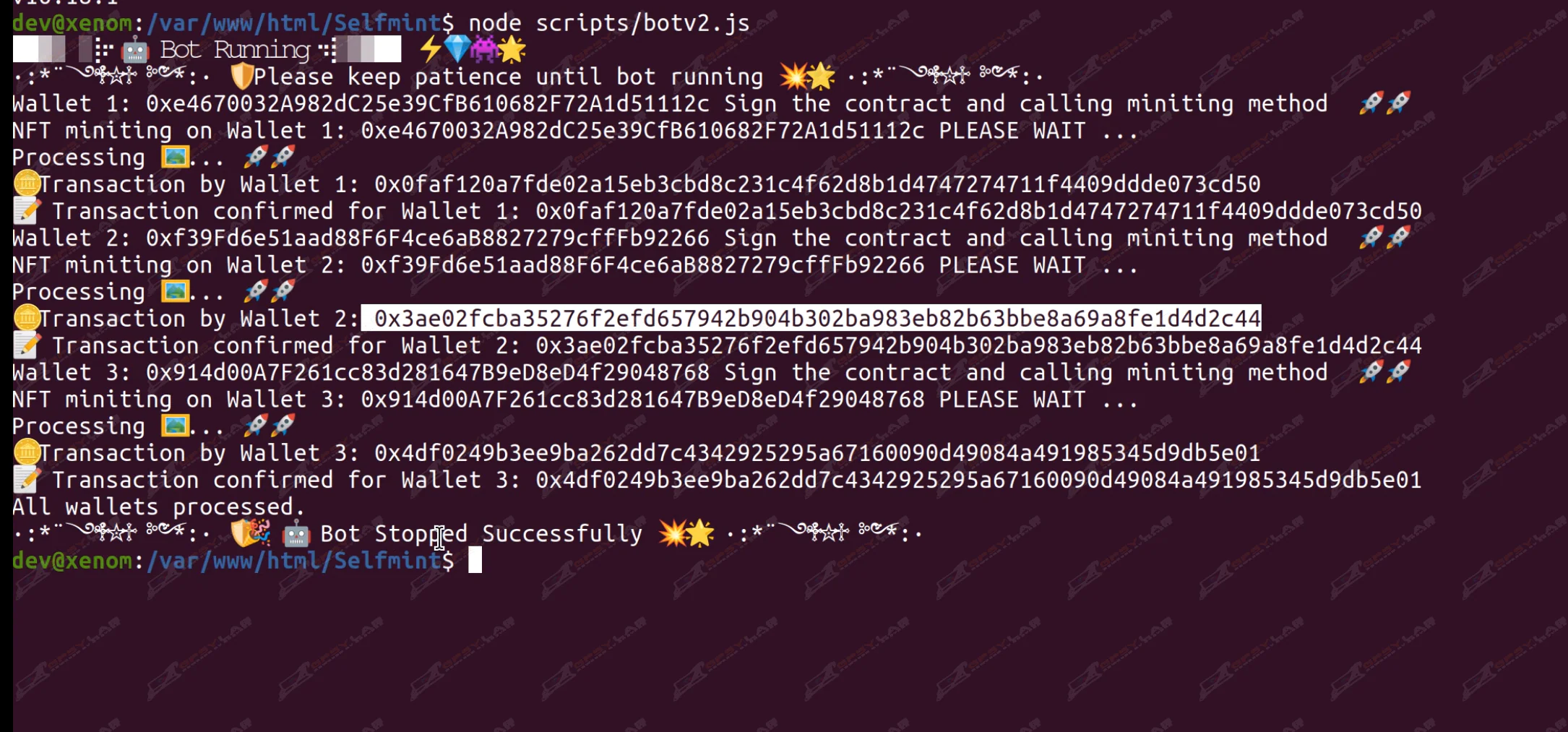 • The bot ensures every wallet successfully mints an NFT and stores the transaction